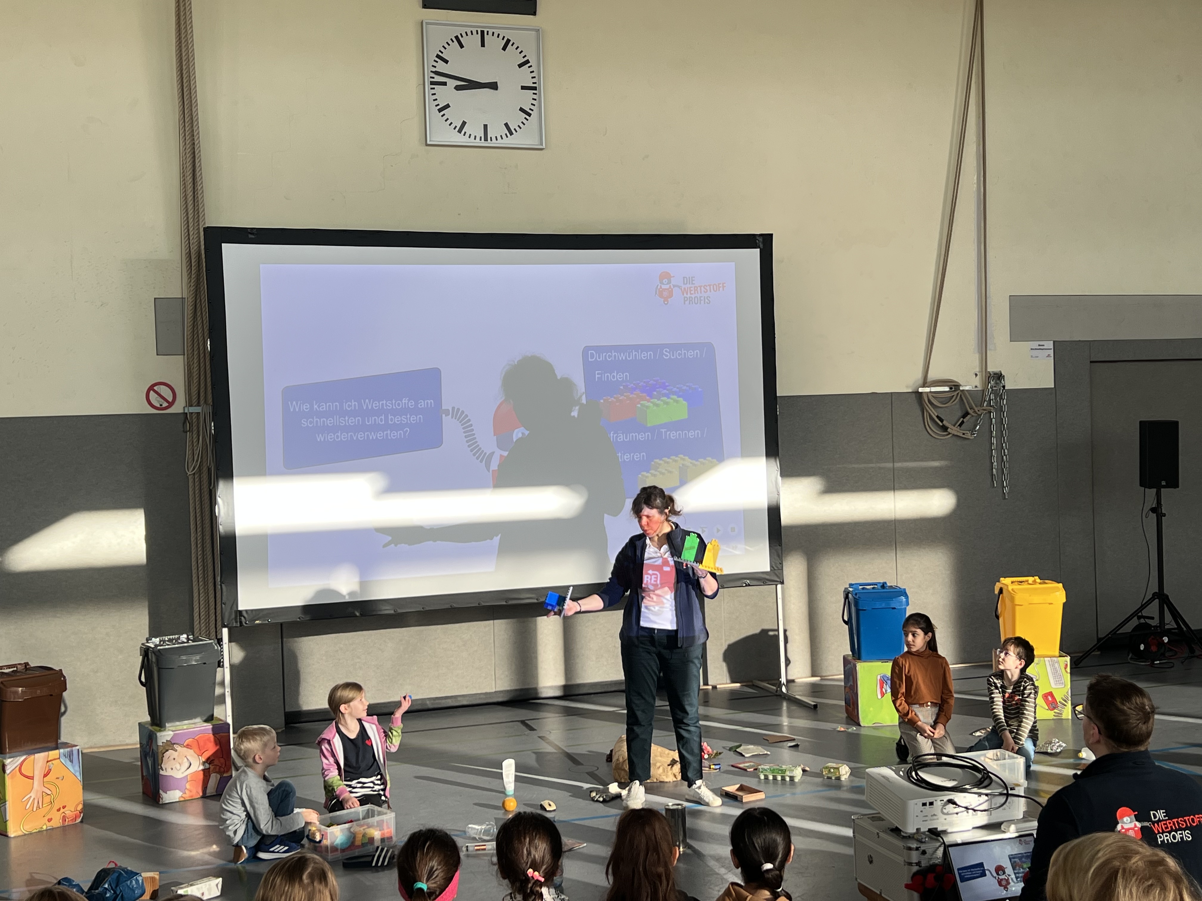 Am Donnerstag, den 5.03.2026 waren die Wertstoffprofis, ein Bildungsprojekt der Remondis Gruppe, an der Grundschule Dernekamp zu Gast. In zwei Vorstellungen wurden die Kinder in die Welt der Müllverwertung eingeführt. Wichtige Begriffe wie Rohstoffe, Wertstoffe, Wertstoffkreislauf, Recycling etc. wurden mit kleinen Spielen und Versuchen anschaulich dargestellt. Auch das Sortieren des Mülls wurde geübt. Alle Kinder waren begeistert dabei. Zum Schluss wurde alles in einem gemeinsamen Lied noch einmal wiederholt.